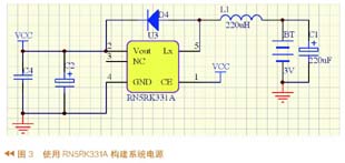本血压计选用2节7号电池作为电源的输入。为了达到较好的供电质量,在此电路中选择了DC/DC升压芯片RN5RK331A,将2节串联的1.5伏7号电池构成的3V左右的电压升到3.3V,供给系统中的模拟电路电源,也作为数字电路的正电源供给MCU(如图3所示)。考虑到气泵、气阀如果与模拟电路、数字电路直接共用一个电源,会引入比较大的干扰,从而影响压力传感器、运放以及MCU的正常工作,所以设计成气泵、气阀不与其它器件接在一起,直接由电池供电。
