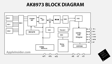 以下是从旭化成公司的网站上得到的AK8973芯片结构图,预计加入电子罗盘功能后,iPhone手机的功能将得到进一步的扩展,以便挑战已经装备有这项功能的T-Mobile Andriod手机--G1.