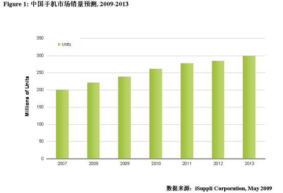 预计中国手机市场2009年的销量为两亿三千八百万台,较去年成长7.8%。然而受经济危机的影响,全球手机的出货量将呈现负增长,出货量为11亿部手机。附图为中国手机市场销量预测, 2009-2013