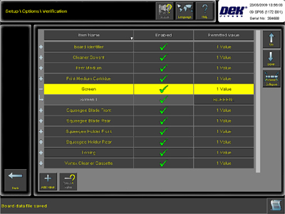 得可的验证和追溯软件是对从事于如汽车和医药重要产业的制造商的重大突破。彻底验证印刷工艺,该软件的验证部分防止错误的耗材使用。譬如,如果载入错误的网板或锡膏,印刷设备便不运作,从而 提供重大的生产力优势。而通过产品文件设置的前期验证,制造只进行于核准的参数和耗材。鉴于先前由操作人员控制此范围,新系统避免费力和易错的人工反复检测,确保始终如一的质量和产量。该系统可被配置暂停生产,并生成辅助工艺灵活性和控制的警报或记录数据。