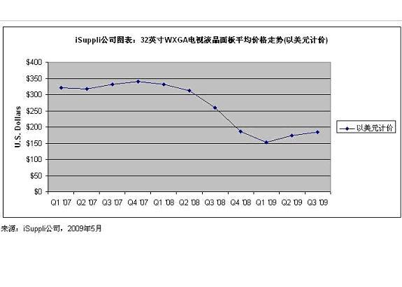 附图所示为iSuppli公司对于2008年10月至2009年第四季度结束时32英寸WXGA TV LCD面板市场的价格预估。这种面板价格可以体现出整体市场趋势。