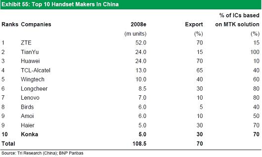 图1:2008年10大国产手机厂商(山寨背景和模式主导)数据来源:巴黎银行/200902