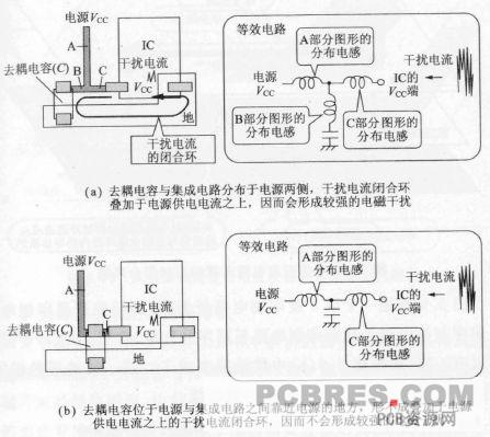例如对于图3. 7 的去稠电容来说,在图3.7(a) 的情况下,去稠电容与集成电路或者大规模集成电路分布于电源的两侧,干扰电流闭合环叠加于电源供电电流之上,因而会形成较强的电磁干扰;而在图3.7(b)的情况下,去搞电容位于电源与集成电路或者大规模集成电路之间靠近电源的地方,结果就形不成叠加于电源供电电流之上的干电流闭合环,因此不会形成较强的电磁干扰。
