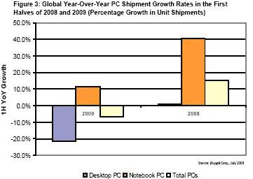如图所示,2009年PC增长率明显低于2008年。而笔记本电脑出货量增长在2009和2008年均保持稳定。