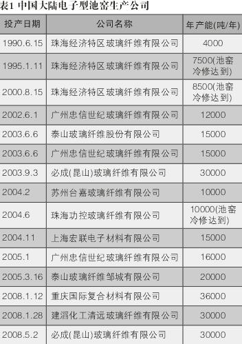 2. 中国大陆电子型池窑生产公司电子纱年产能及其投产日期。(见表1)