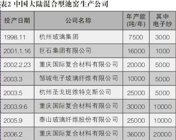 3.中国大陆混合型池窑生产公司电子纱年产能及其投产日期。(见表2)