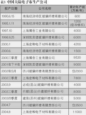 4.中国大陆电子布生产公司电子布累计年产能及其投产日期。(见表3)