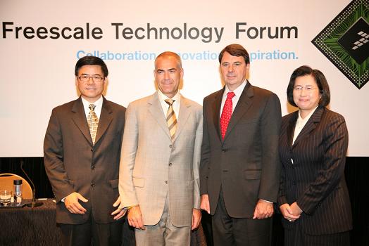 飞思卡尔全球高官齐聚一堂:从左至右分别为:飞思卡尔半导体副总裁兼亚洲区总经理汪凯博士、高级副总裁兼首席市场营销官Henri Richard、董事会主席兼首席执行官Rich Beyer和高级副总裁兼网络和多媒体部总经理Lisa T. Su博士