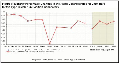 iSuppli 公司认为,第二季度订单比第一季度增长15-16%,出货量增长7-9%。这种趋势与其它商品市场一致。但是,连接器领域补充库存的势头不太强。图5 所示为亚洲每月连接器合同价格的百分比变动率,以代表市场趋势的未来四个季度预测。