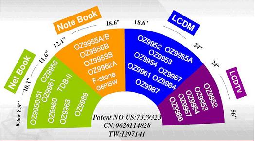 基于这样的技术积累,目前凹凸科技已成为拥有最广泛LCD背光驱动IC产品线的厂商,如图1所示,从上网本到笔记本电脑再到LCD显示器模块、LCD TV,尺寸从8.9吋横跨到56吋,凹凸科技能提供满足各类应用需的相应LED驱动器解决方案(具备不同的效率等级、PWM接口、不同通道数),包括3x9、4x7、4x8、6x10、8x8、8x9等不同配置。多种技术特性如集成高速PWM功能、采用快速切换的开关模式、突波模式与相移技术,及其专有的区域照明等技术,则可帮助开发人员解决多串数LED均流、LED线性调光所产生的噪声、功率耗散,以及厂商对于保护规格要求不一等挑战。