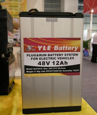 深圳毅力能源是二次锂电池产品的供应商,其产品广泛应用于手机、笔记本电脑、数码产品、家电和电动器材等。在东莞IIC现场,该公司业务经理杜伟表示,深圳毅力的锂电产品采用的是原装日本电芯,与国内同类产品相比,毅力能源的锂电产品具有高容量、高质量的优点。该公司尤其在电动车锂电池系统方面具有相当的知名度。毅力能源全球首创“快速插换式”锂电池系统,使最多可安装3组不同电量状况或类型的独立使用锂电池组,当一组电池用完后,电池管理系统会自动切换到下一组电池继续使用。下图所示,是毅力能源在IIC东莞上展出的KLF5216电池系统,其重量只有9.5kg,最大连续放电电流为60安培,最大瞬间放电电流为100A(30s),据称一次满充后能使电动摩托车续航85公里。